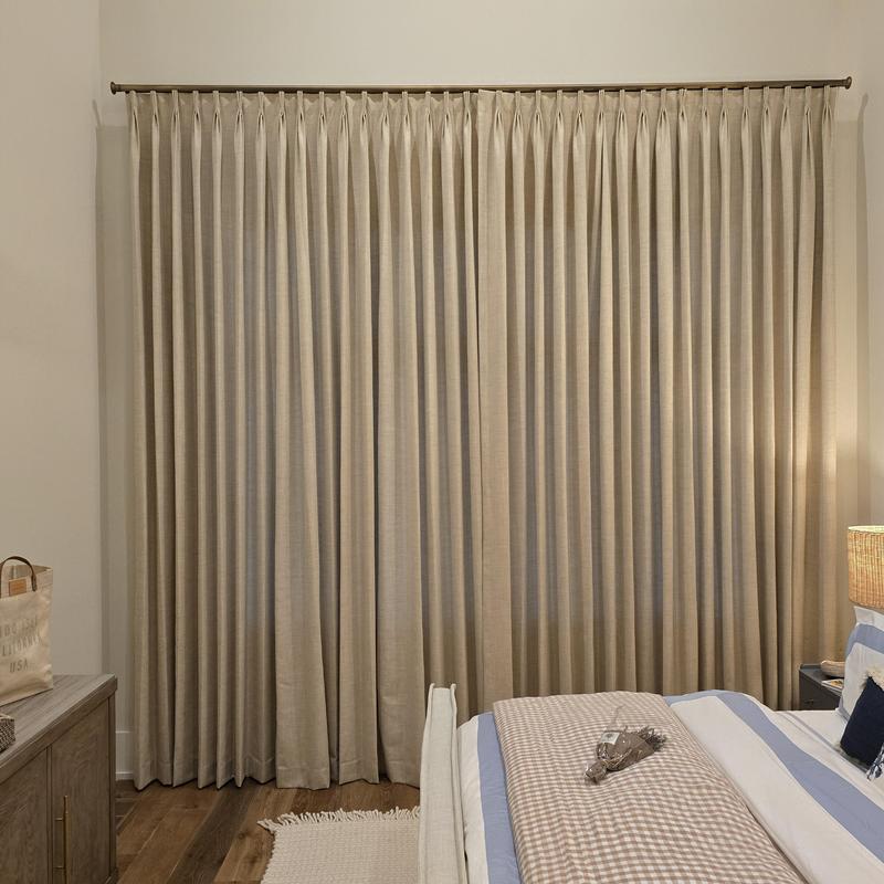 Pinnacle Custom Window Coverings installed pinch pleated draperies in a home in Nolensville, Tennessee. The draperies were made from custom fabrics and fit specifically for the space, providing effective window coverage and a consistent appearance throughout the room.